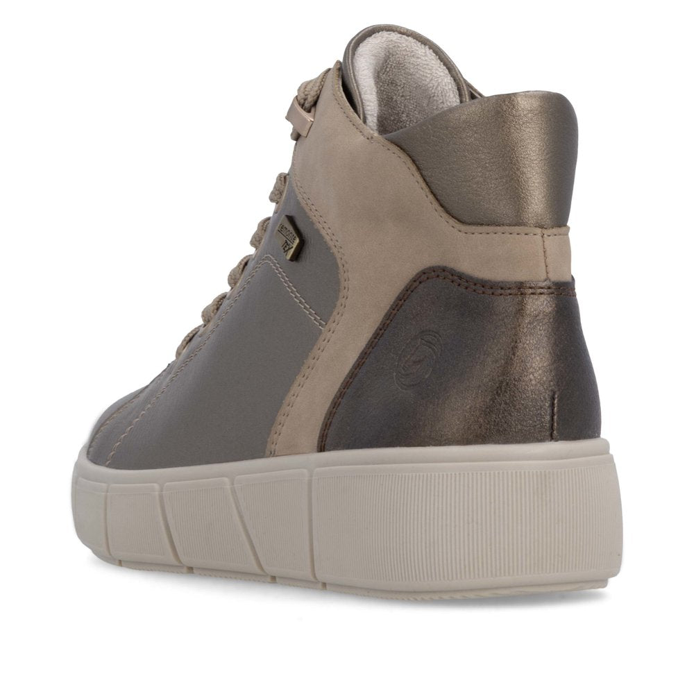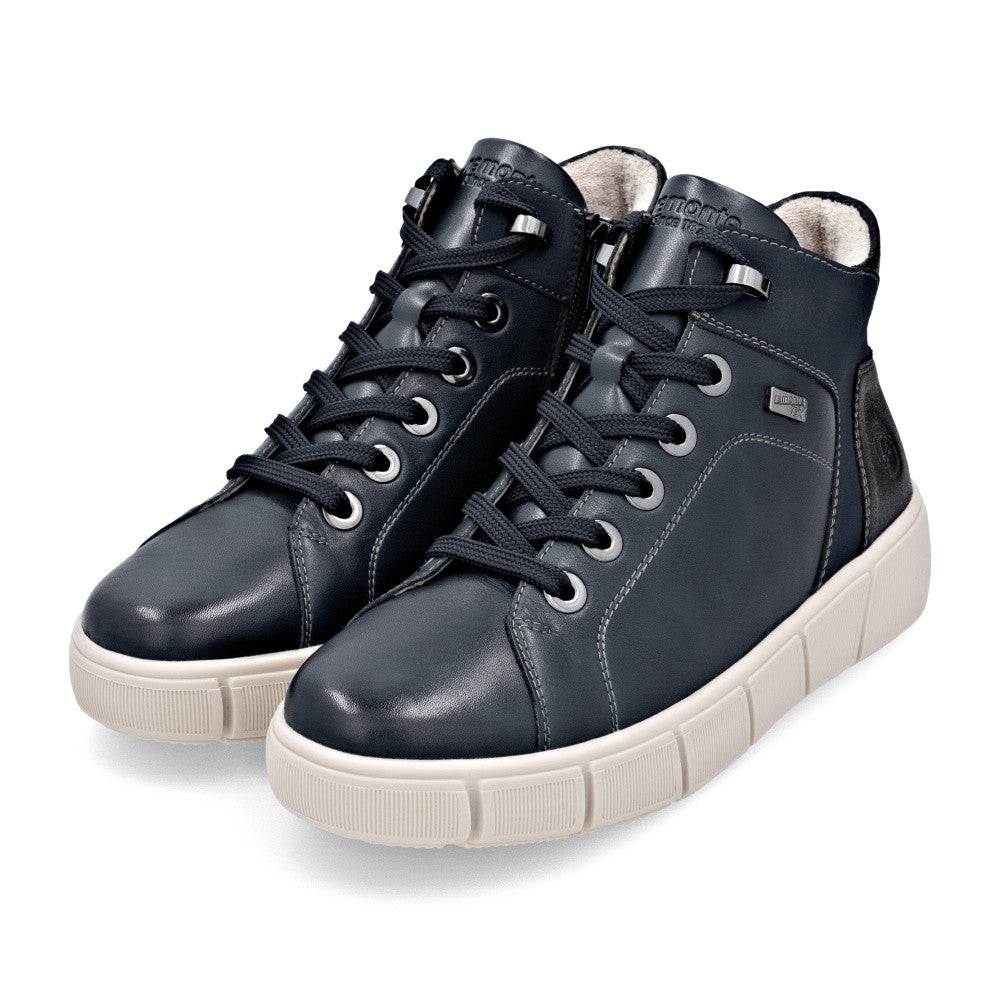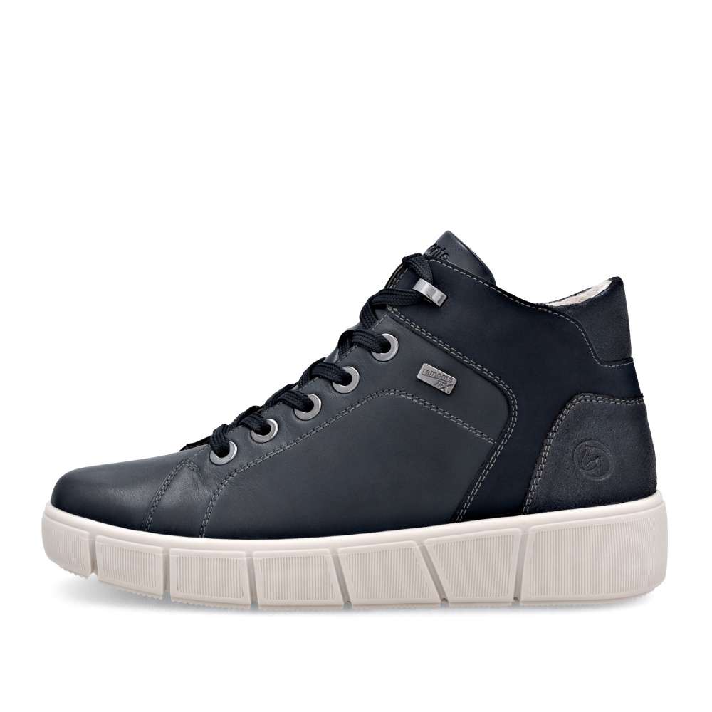 Clear the stage! These white black remonte high-top sneakers made of smooth leather are absolute allround talents! The lacing complements the zipper and thus guarantees optimal support and perfect fit. In addition, there are exchangeable laces. The grippy and flexible sole, together with the padded and removable insole, creates a pleasant feeling underfoot. The comfort width offers enough space for the feet to feel comfortable even when worn for longer periods. Thanks to the water-repellent remonteTEX membrane, the best comfort is ensured even on wet and cold days. You can't get more style than this!